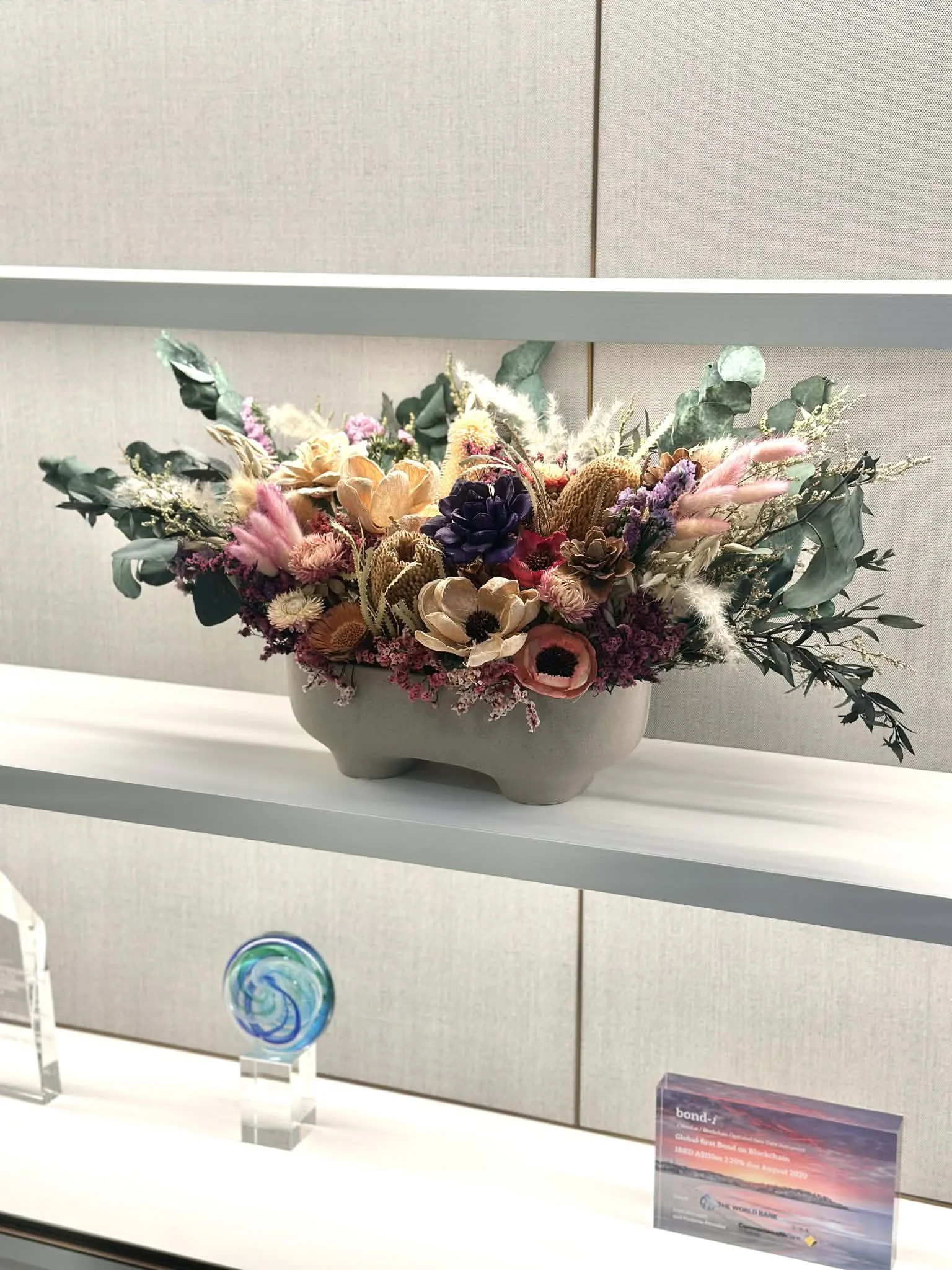 Unlike traditional florists, we focus solely on premium dried flowers and preserved botanicals. This allows us to create architectural, sculptural installations specifically designed for corporate spaces.